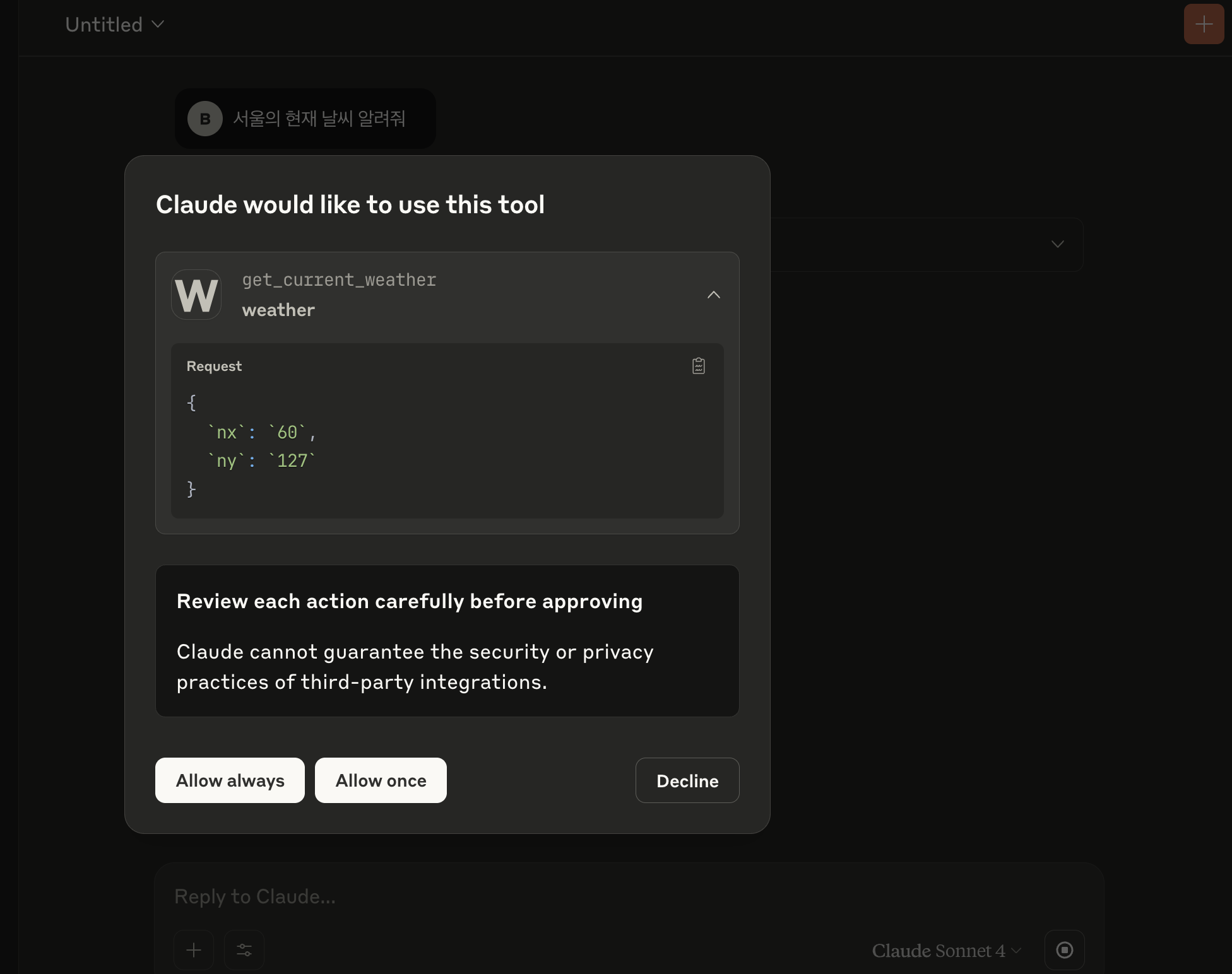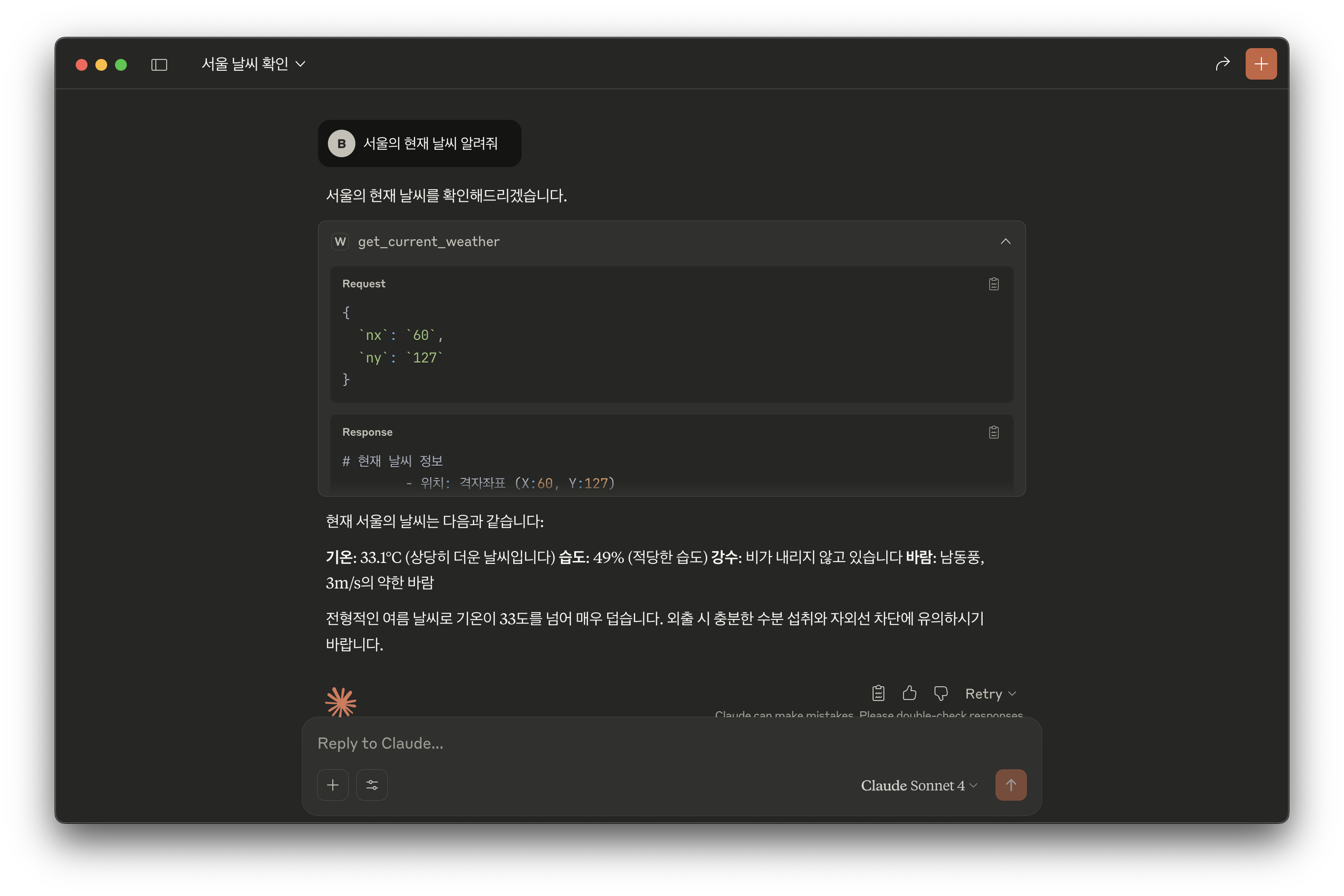 7. Claude Desktop에서 프롬프팅! - 서울의 현재 날씨를 알려줘