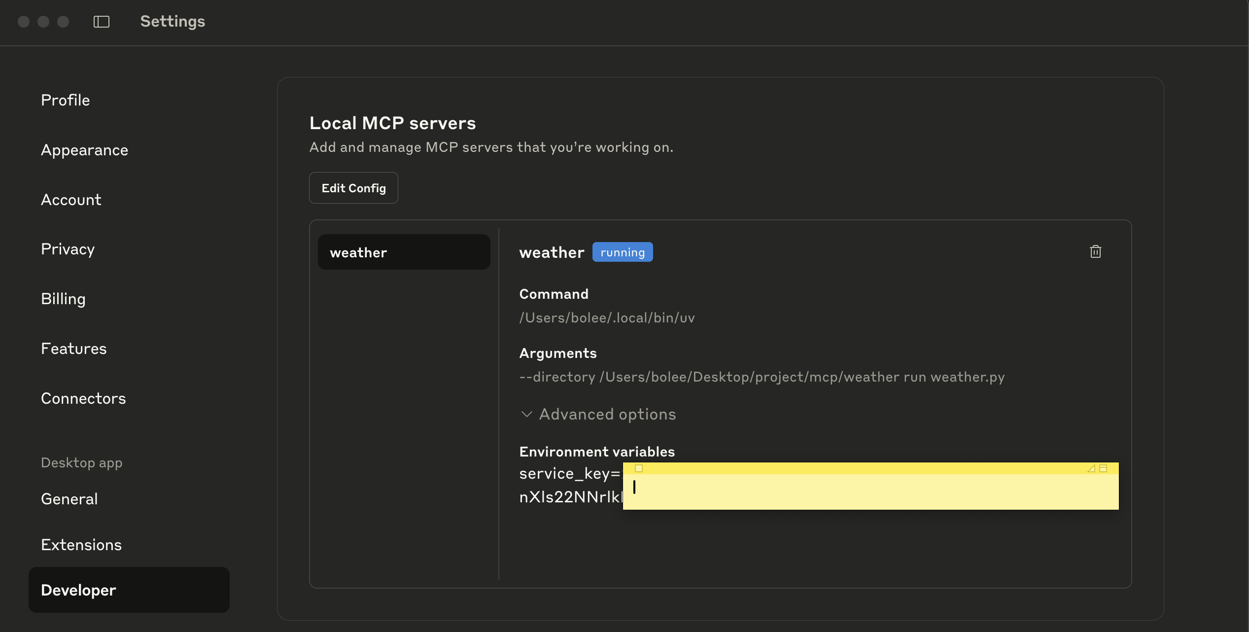 6. Claude Desktop 껐다 다시 켜면 아래와 같이 service_key가 환경변수(Environment variables)로 등록된 것을 확인할 수 있음