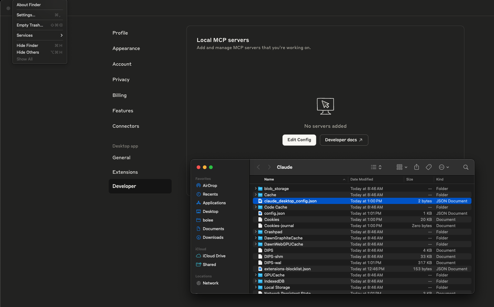1) Claude Desktop > Settings > Developer > Edit Config를 클릭하면 아래 사진과 같이 Claude 폴더가 열림