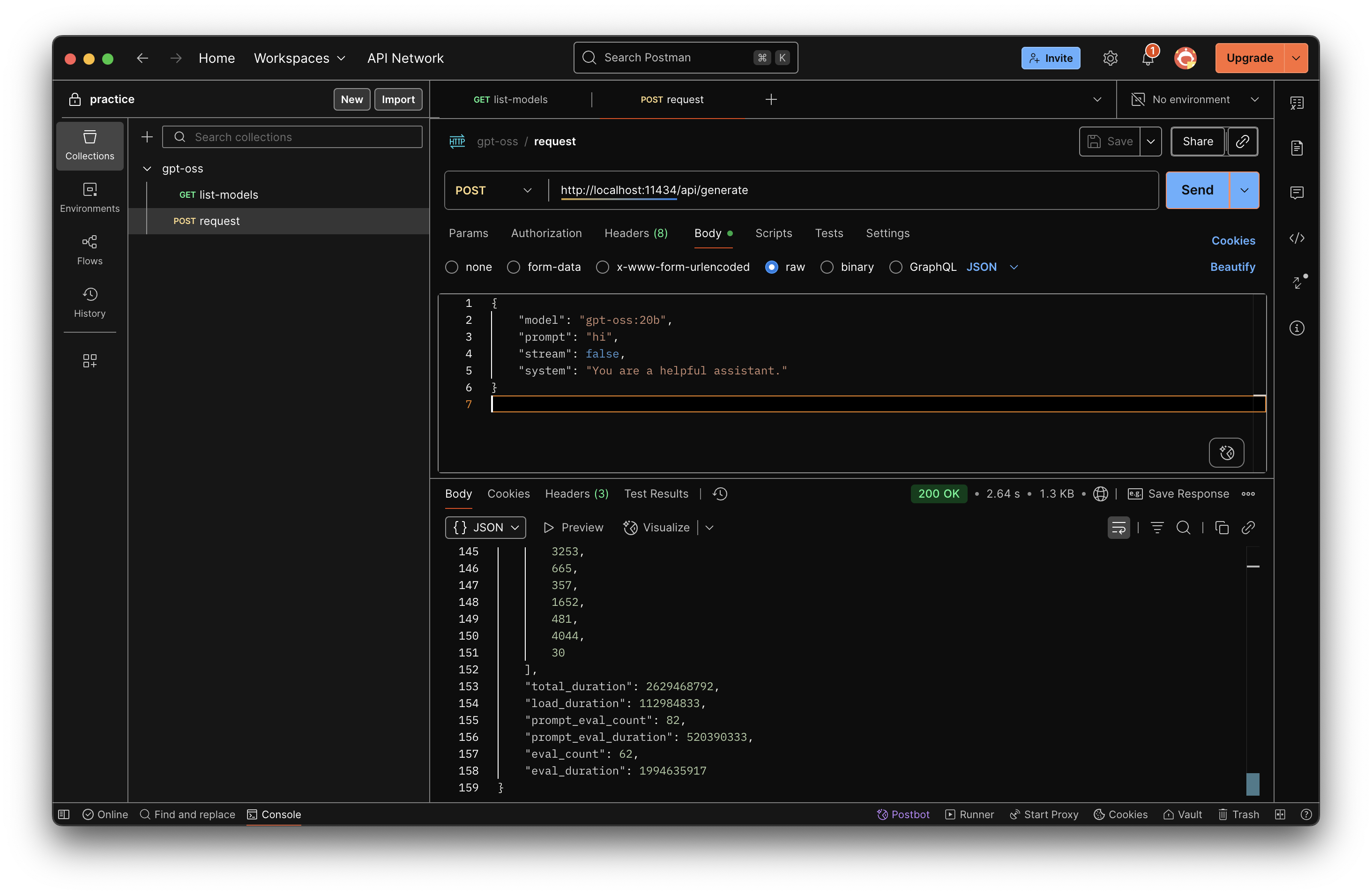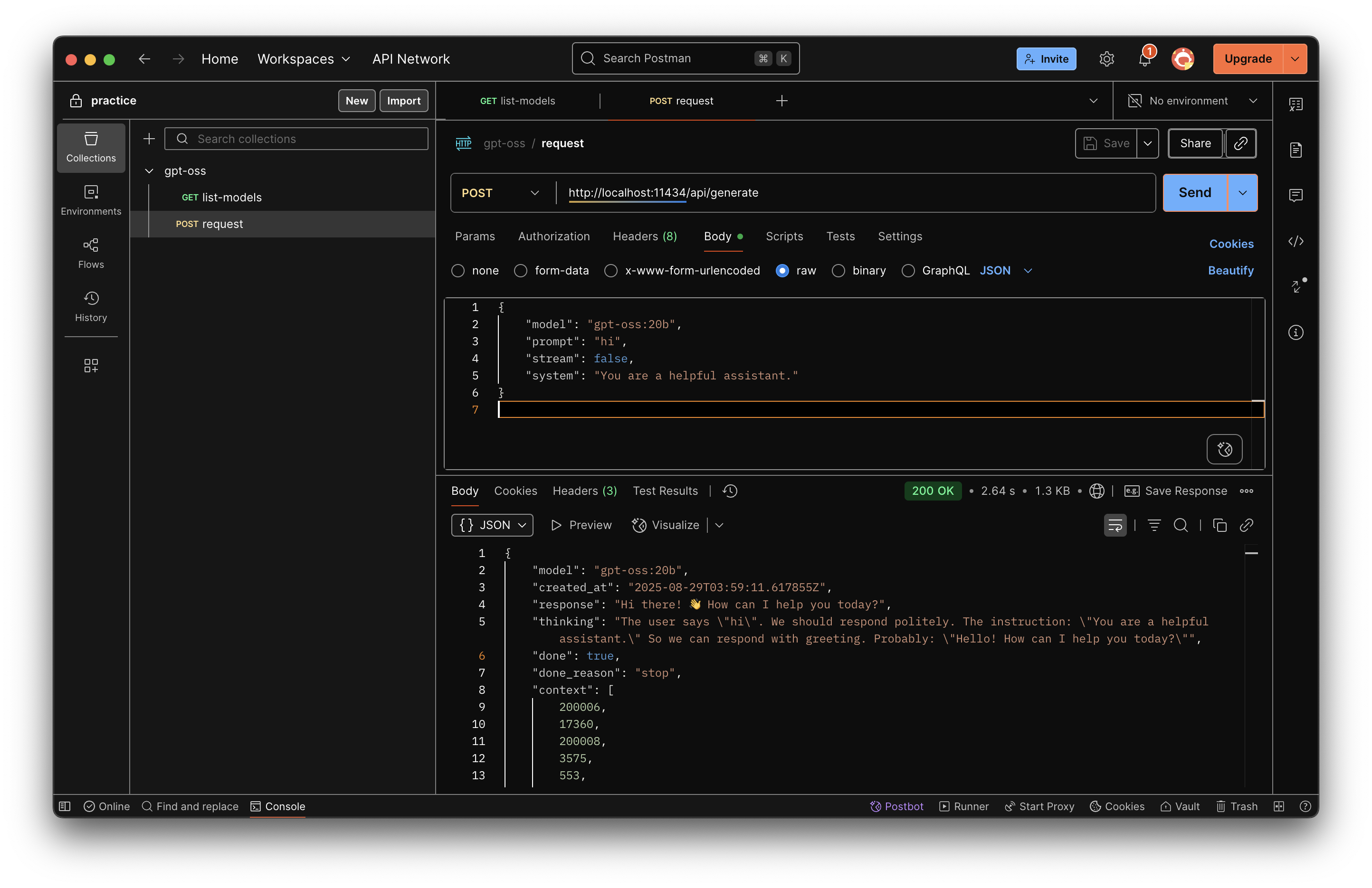 Postman에서 POST http://localhost:11434/api/generate를 호출하면 아래와 같이 모델에 대한 데이터 목록이 출력됨