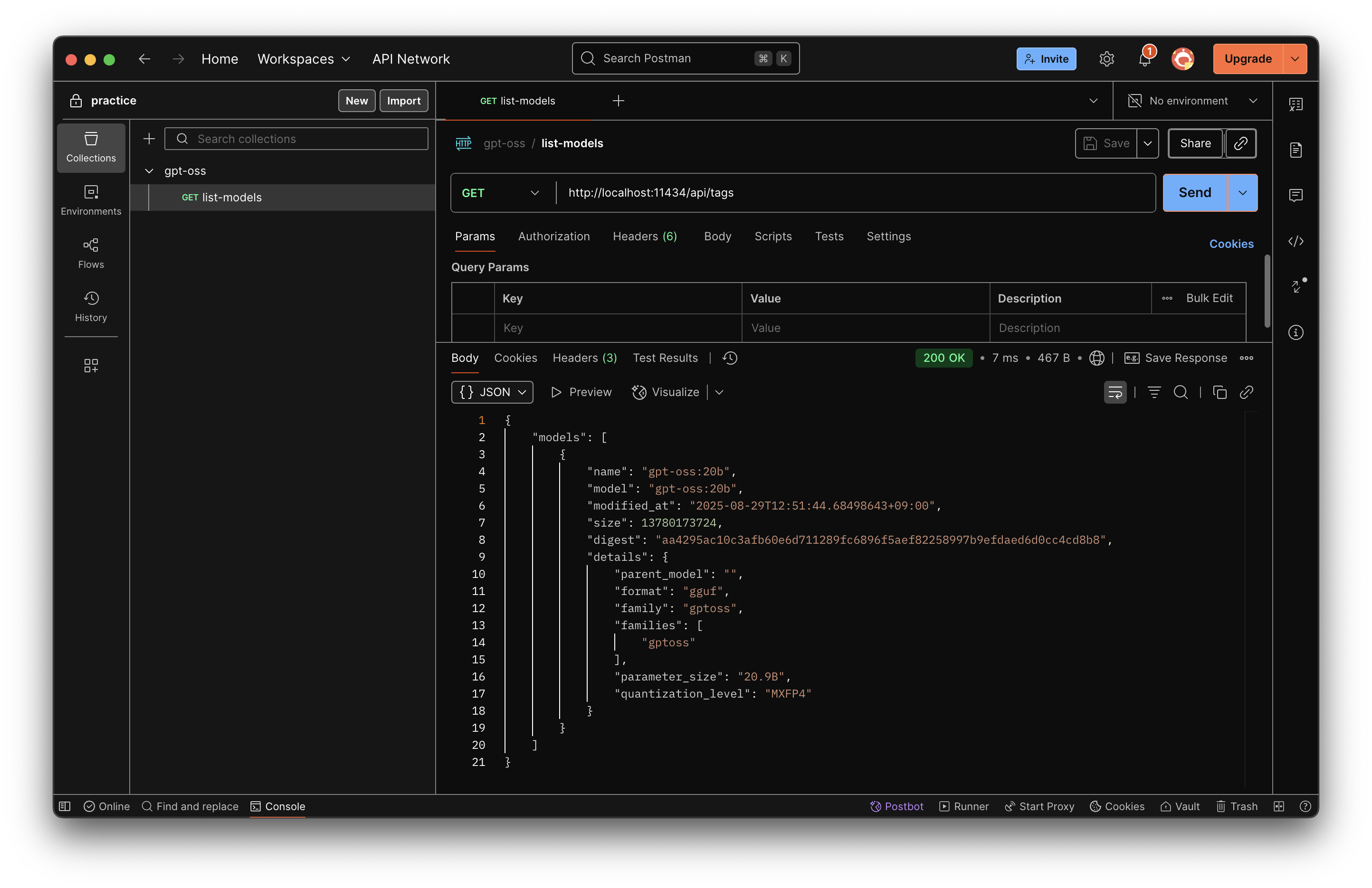 Postman에서 GET http://localhost:11434/api/tags를 호출하면 아래와 같이 모델에 대한 데이터 목록이 출력됨