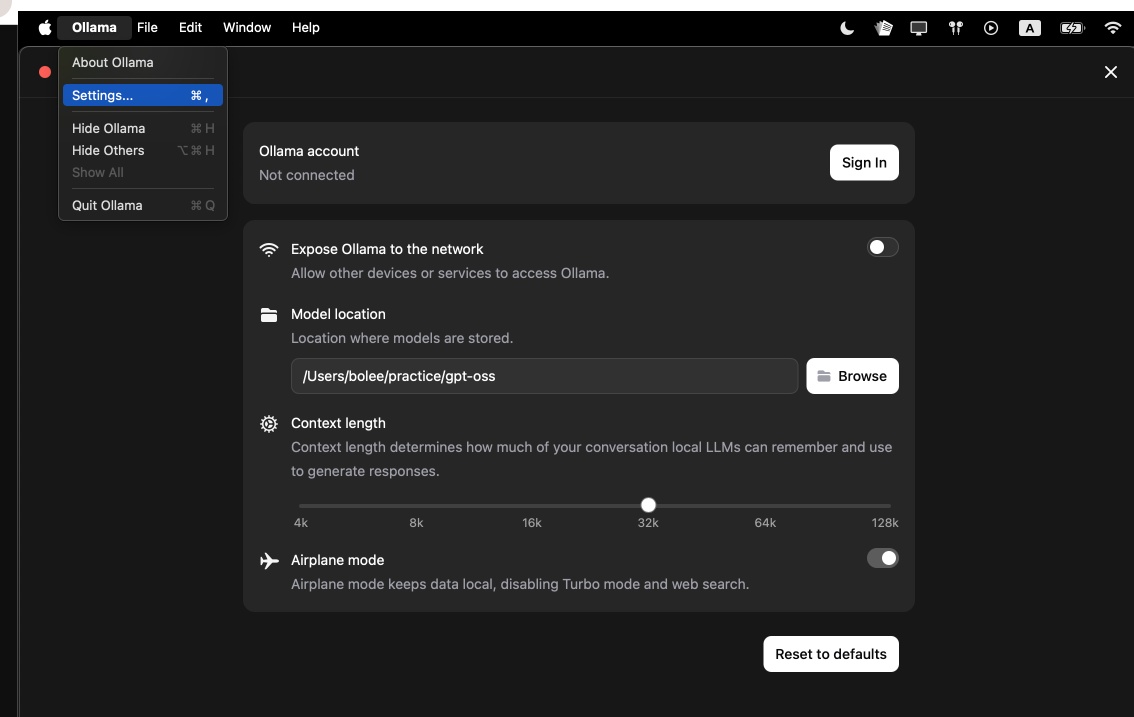 2. ollama를 열고 Settings에서 Airplane mode로 변경하여 로컬로 유지하도록 하기