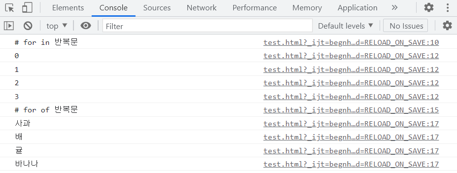 for (const 반복 변수 in 배열 또는 객체) { 문장 }