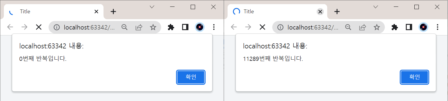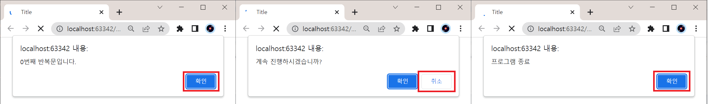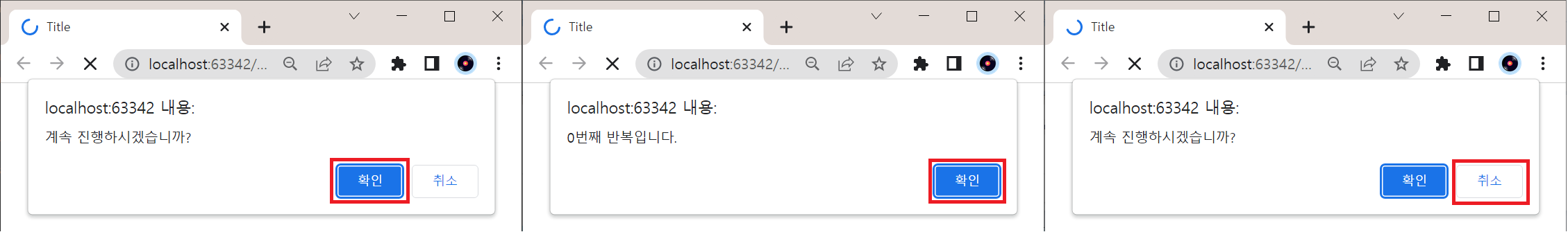 출력 결과 : 확인 버튼을 누르면 'i번째 반복입니다.' 경고창이 뜨고, 취소를 누르면 반복이 종료됨