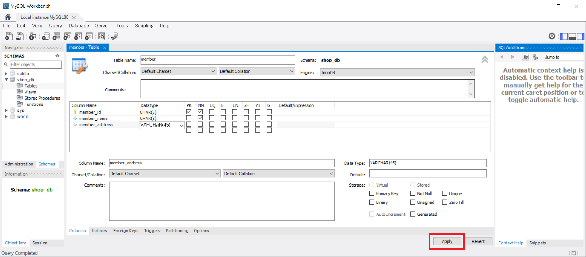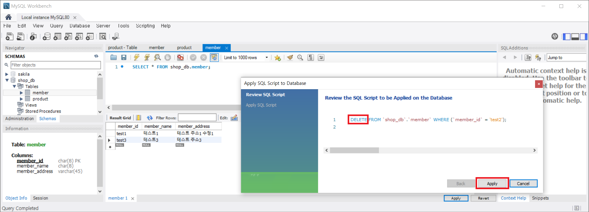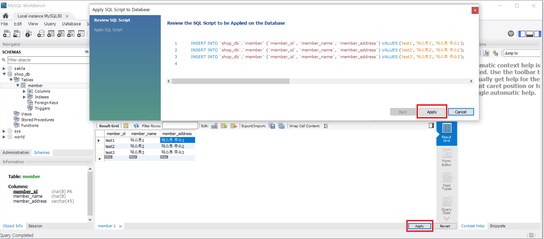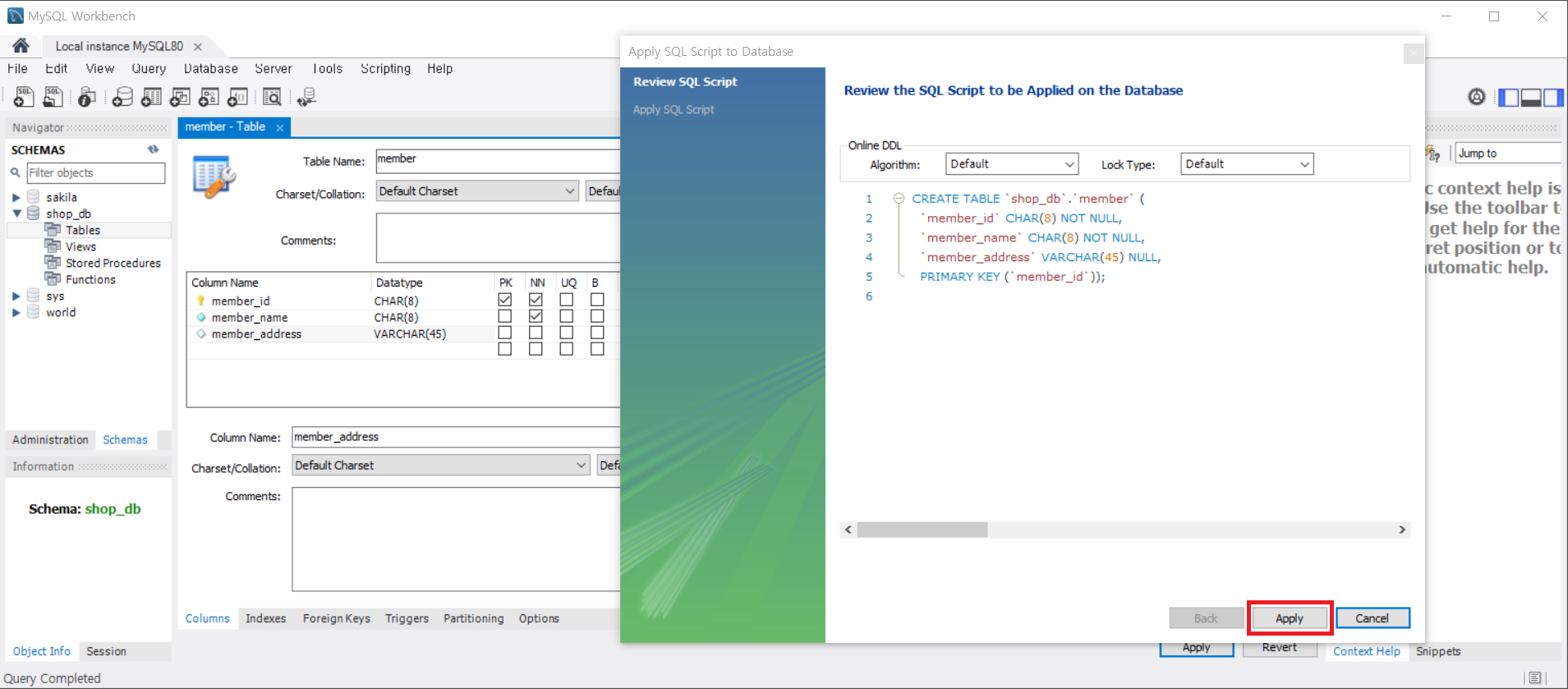 - 'Apply'를 누르면 SQL 명령문을 확인할 수 있음
