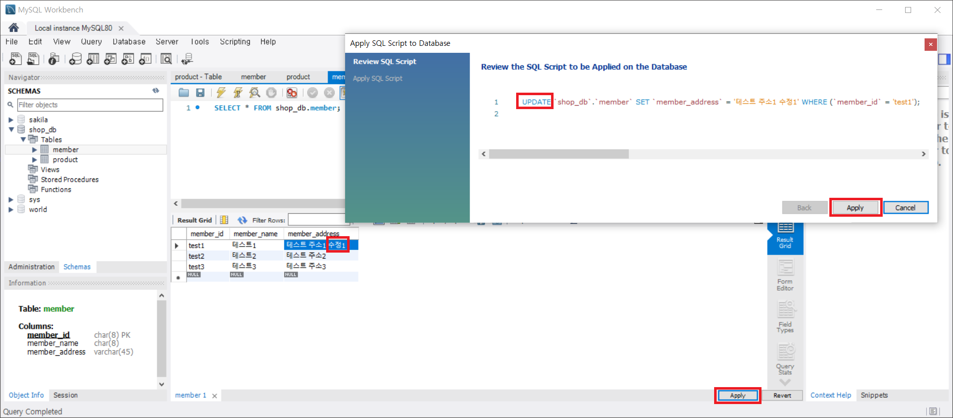 - 데이터 수정 입력하고 'Apply'를 누르면 'UPDATE ~'라는 SQL 명령문을 확인할 수 있음