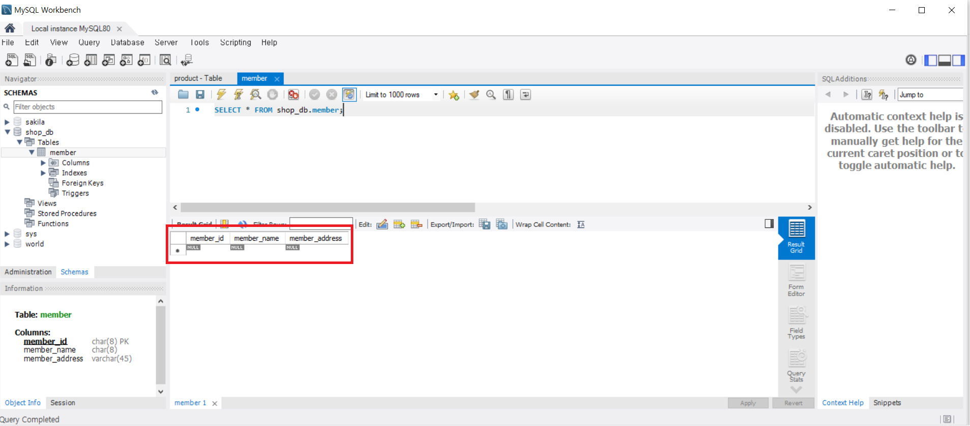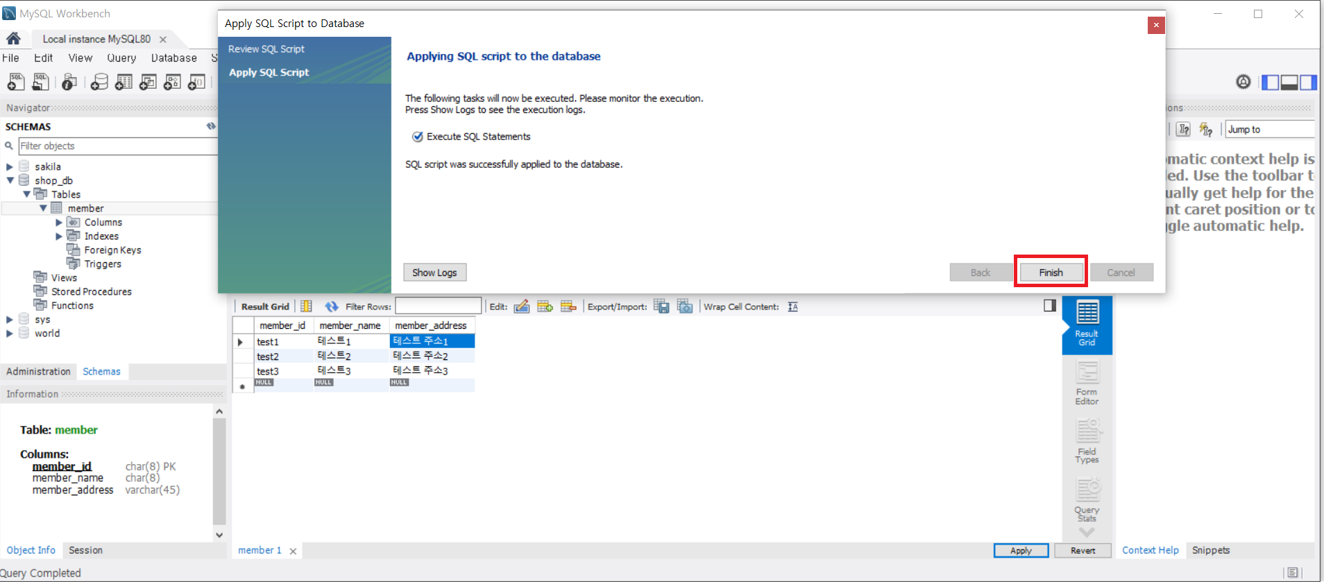 - SQL 명령문이 데이터베이스에 적용된 것을 확인할 수 있음