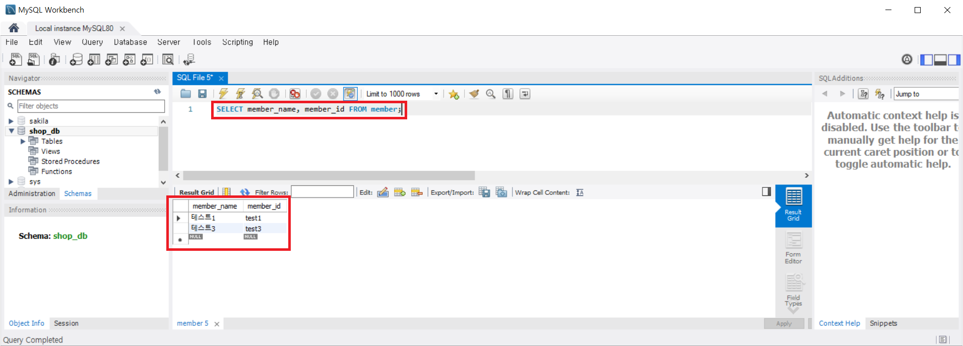 1-4) 여러줄로 적어도 특정 부분을 선택하고 실행하면 해당 부분의 데이터만 조회할 수 있음