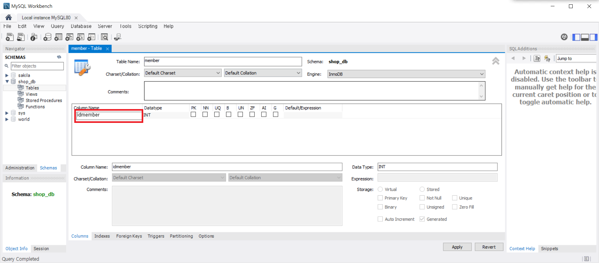 - 'Datatype'을 선택하고, PK(Primary Key) / NN(Not Null) / UQ(Unique) / B / UN / ZF / AI / G