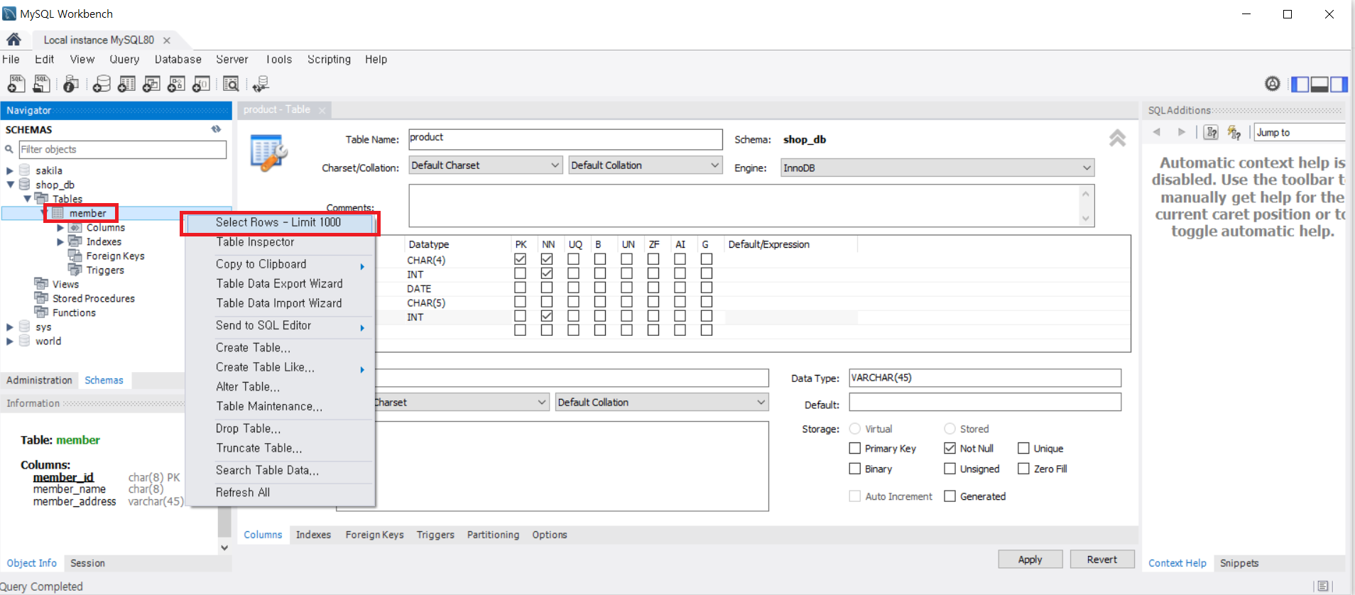 - 생성한 테이블을 선택하고, 마우스 우클릭 후 'Select Rows - Limit 1000' 선택