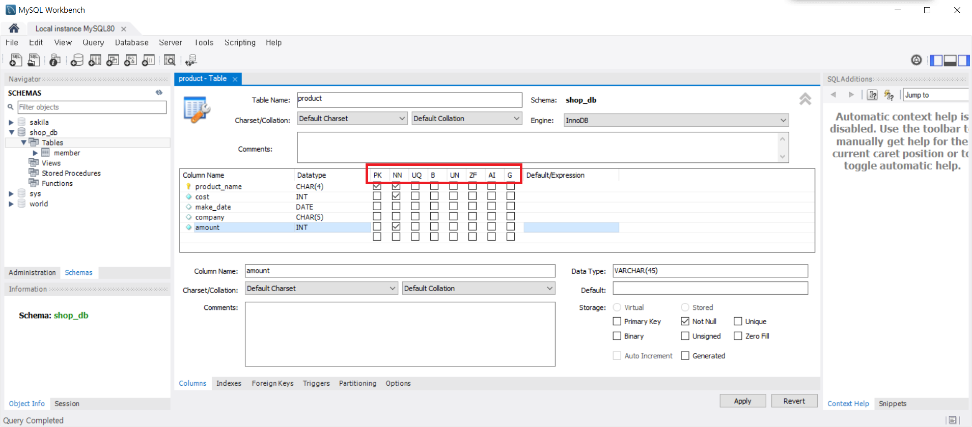 MySQL 워크벤치에서 데이터를 만들 때 열(Column)에서 PK, NN, UQ, BIN, UN, ZF, AI, Default/Expression를 볼 수 있는데, 이는 제약 조건을 의미한다. 각각 어떤 의미인지 설명하고자 한다.