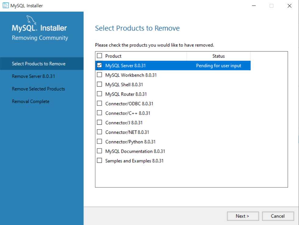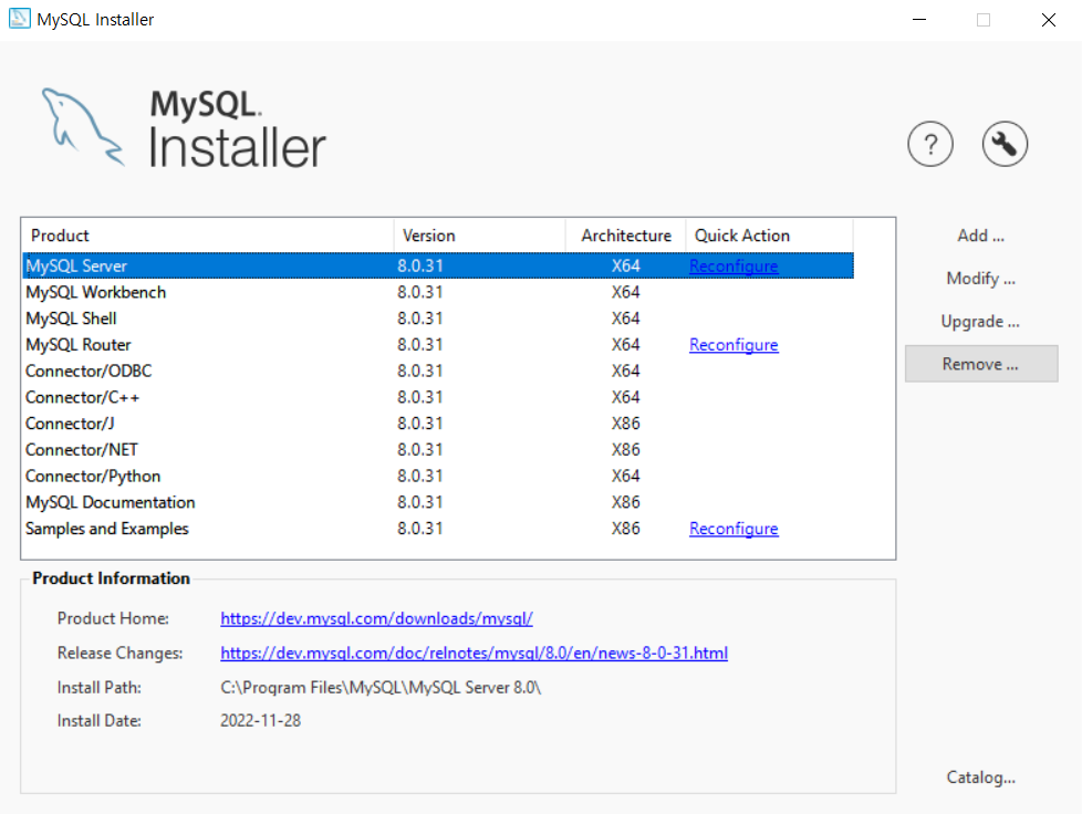 1. MySQL Installer - Community 프로그램 실행 후 MySQL Server 선택하고 Remove 클릭