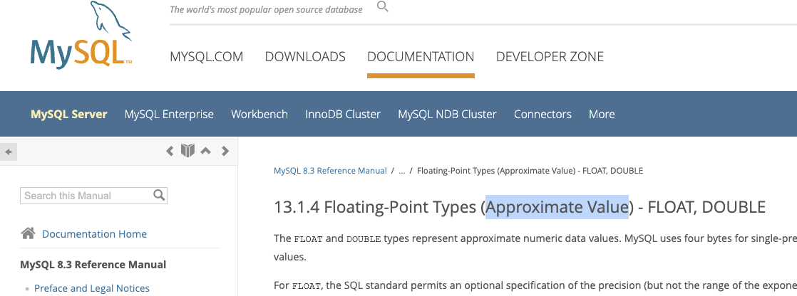 소수점이면 float나 double이겠지라고 생각하고 DB 칼럼의 타입을 지정했다가는 근사치 값으로 연산이 이뤄지는 불상사가 일어날 수 있다. 아래 사진에서와 같이 MySQL 문서에서도 아예 제목 옆에 'Approximate Value(근사값)'라고 적고 있다.